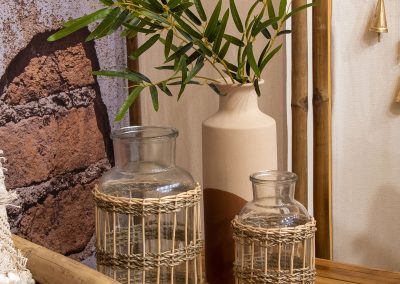 Fabricada en cristal material resistente y duradero perfecto para utilizar en la decoración de tu hogar, este material va recubierto de un trenzado en fibras naturales que le dan es estilo y el toque de originalidad que estás buscando.