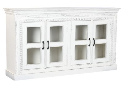 Tiene un acabado en blanco desgastado y cuenta con muchos detalles grabados en la madera que le dan carácter y estilo únicos.