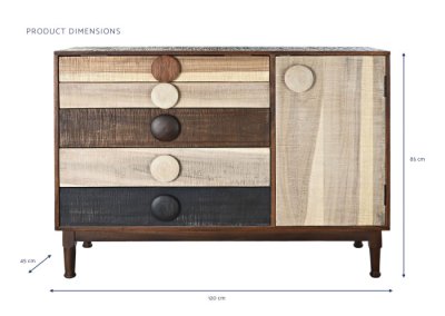 Lo más caracteristico de este buffet a parte de la combinación de tonalidades son sus tiradores, muy característicos con su forma redonda.