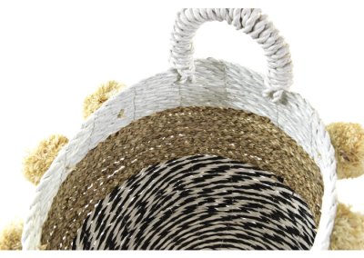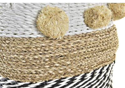 La cesta seagrass beig cumple con todos estos requisitos disponible en dos tamaños diferentes, podrás elegir la que más se adapte a tus necesidades y a tu espacio. Esta cesta esta decorada no sólo con diferentes colores en su fibra natura de seagrass sino que como añadido incorpora unos pompones para conseguir ese acabado tan deseado y decorativo. Cuenta con un par de asas para que puedas moverla sin problemas.