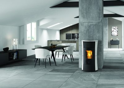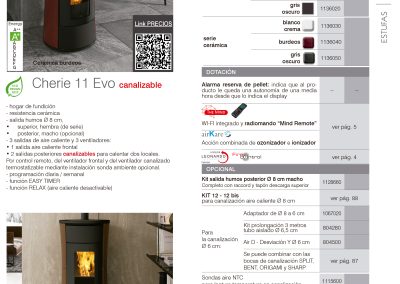 Modelo diseñado para un fácil acceso a mantenimientos. Largo: 63cm. Profundidad: 58cm. Altura: 116cm. Potencia útil: 3,6-11,4kw. Rendimiento (%): 91,3%. Consumo mín-máx. (kg/h): 0,8-2,6kg/h. Volumen calefactable (m3): 295m3. Capacidad del depósito (kg): 18kg/h. Autonomía mín-máx (h.): 7-23. Peso (kg): 295kg. Diámetro salida de humos (mm): 80mm. Diámetro aspiración de aire (mm): 40mm. Programación diaria / semanal. Función EASY TIMER. Sistema The Mind con WI-FI integrado. Radiomando “Mind Remote”. Resistencia cerámica. Función RELAX (aire caliente desactivable).