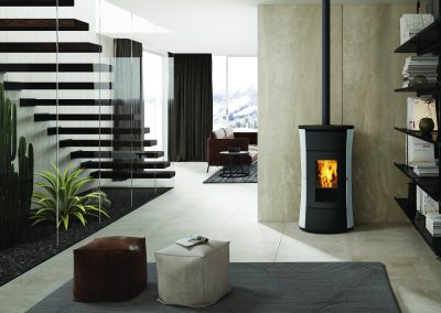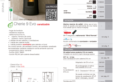 Modelo diseñado para un fácil acceso a mantenimientos. Largo: 63cm. Profundidad: 58cm. Altura: 116cm. Potencia útil: 3,7-9kw. Rendimiento (%): 89,2%. Consumo mín-máx. (kg/h): 0,9-2,1kg/h. Volumen calefactable (m3): 235m3. Capacidad del depósito (kg): 18kg/h. Autonomía mín-máx (h.): 9-20. Peso (kg): 218kg. Diámetro salida de humos (mm): 80mm. Diámetro aspiración de aire (mm): 40mm. Programación diaria / semanal. Función EASY TIMER. Sistema The Mind con WI-FI integrado. Radiomando “Mind Remote”. Resistencia cerámica. Función RELAX (aire caliente desactivable).
