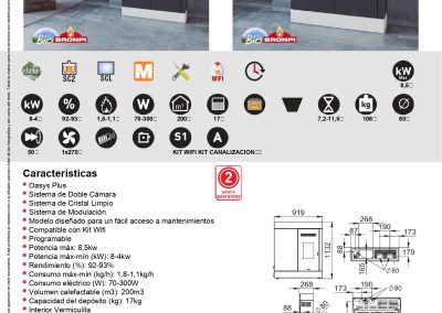 Oasys Plus. Sistema de Doble Cámara. Sistema de Cristal Limpio. Sistema de Modulación. Modelo diseñado para un fácil acceso a mantenimientos. Compatible con Kit Wifi. Programable. Potencia máx: 8,5kw. Potencia máx-mín (kW): 8-4kw. Rendimiento (%): 92-93%. Consumo máx-mín (kg/h): 1,8-1,1kg/h. Consumo eléctrico (W): 70-300W. Volumen calefactable (m3): 200m3. Capacidad del depósito (kg): 17kg. Interior Vermiculita. Quemador en fundición. Autonomía mín-máx (h.): 7,2-11,5h. Peso (kg): 108kg. Diámetro salida de humos (mm): 80mm. Diámetro aspiración de aire (mm): 50mm. Ventilación forzada (n° x m3): 1×270. Mando a distancia o centralita. Posibilidad de salida de humos superior, lateral o trasera.. Sistema seguridad: S1. Termostato seguridad pellet. Depresímetro. Accesorios compatibles no incluidos: KIT WIFI; KIT CANALIZACION.