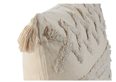 Cojín cuadrado en color crudo, con bordado en la parte delantera. Incluye relleno. Es desfundable gracias a su cremallera en la parte superior. En sus cuatro puntas lleva cosidos borlas del mismo color crudo que es el propio cojin y el bordado. Material utilizado en el cojín poliester y en el relleno algodón.