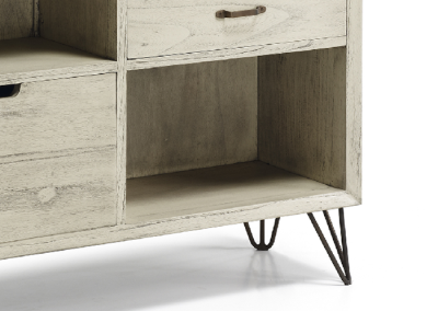 Nuestra consola Riuma destaca por su acabado en color crema desgastado y la cantidad de espacio de almacenamiento que ofrece gracias a sus dos cajones, dos espacios de almacenamiento a la vista y su puerta abatible.