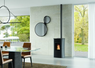 Modelo diseñado para un fácil acceso a mantenimientos. Largo: 57cm. Profundidad: 54cm. Altura: 96cm. Potencia útil: 8kw. Rendimiento (%): 90%. Consumo mín-máx. (kg/h): 0,6-1,9kg/h. Volumen calefactable (m3): 210m3. Capacidad del depósito (kg): 15kg/h. Autonomía mín-máx (h.): 8-25. Diámetro salida de humos (mm): 80mm. Diámetro aspiración de aire (mm): 60mm. Programación diaria / semanal. Función EASY TIMER. Resistencia cerámica. Sistema The Mind con WI-FI integrado.