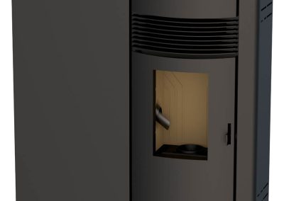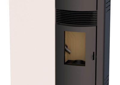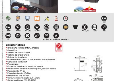 Potencia máx-mín: 10-5 kw. Rendimiento (%): 91-92%. Consumo máx-mín (kg/h): 2,3-1,2kg/h. Consumo eléctrico (W): 65-300W. Volumen calefactable (m3): 250m3. Capacidad del depósito (kg): 17kg. Interior Vermiculita. Quemador en fundición. Autonomía mín-máx (h.): 7,4-14,2h. Peso (kg): 120kg. Diámetro salida de humos (mm): 80mm. Diámetro aspiración de aire (mm): 50mm. Ventilación forzada (n° x m3): 1×380. Mando a distancia o centralita. Sistema seguridad: S1.: Termostato seguridad pellet, Depresímetro. Accesorios compatibles no incluidos: KIT WIFI; KIT DE CANALIZACIÓN.
