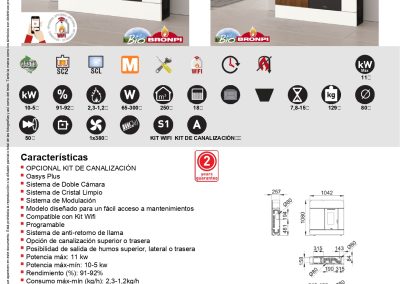 OPCIONAL KIT DE CANALIZACIÓN. Oasys Plus. Sistema de Doble Cámara. Sistema de Cristal Limpio. Sistema de Modulación. Modelo diseñado para un fácil acceso a mantenimientos. Compatible con Kit Wifi. Programable. Opción de canalización superior o trasera. Posibilidad de salida de humos superior, lateral o trasera. Potencia máx: 11 kw. Potencia máx-mín: 10-5 kw. Rendimiento (%): 91-92%. Consumo máx-mín (kg/h): 2,3-1,2kg/h. Consumo eléctrico (W): 65-300W. Volumen calefactable (m3): 250m3. Capacidad del depósito (kg): 17kg. Interior Vermiculita. Quemador en fundición. Autonomía mín-máx (h.): 7,4-14,2h. Peso (kg): 119kg. Diámetro salida de humos (mm): 80mm. Diámetro aspiración de aire (mm): 50mm. Ventilación forzada (n° x m3): 1×380. Mando a distancia. Tolva hermética. Sistema seguridad: S1.: Termostato seguridad pellet, Depresímetro. Accesorios compatibles no incluidos: KIT WIFI; KIT DE CANALIZACIÓN.