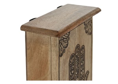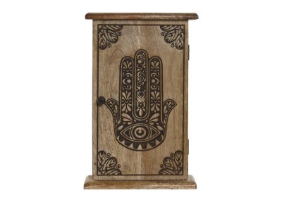 Consigue un recibidor familiar y organizado con nuestro Guardallaves mano de Fátima fabricada en madera de mango, llega grabado en su puerta la mítica Mano de Fátima, lo que lo hace único y añade a tu hogar un toque místico. Cuenta con 6 ganchos donde colocar tus llaves y una puerta para cerrarlo y mantener todo fuera de la alcance de la vista.