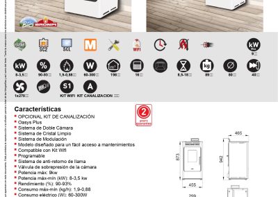OPCIONAL KIT DE CANALIZACIÓN. Oasys Plus. Sistema de Doble Cámara. Sistema de Cristal Limpio. Sistema de Modulación. Modelo diseñado para un fácil acceso a mantenimientos. Compatible con Kit Wifi. Programable. Válvula de sobrepresión de la cámara. Potencia máx: 9kw. Potencia máx-mín (kW): 8-3,8 kw. Rendimiento (%): 90-93%. Consumo máx-mín (kg/h): 1,9-0,88. Consumo eléctrico (W): 60-300W. Volumen calefactable (m3): 200m3. Capacidad del depósito (kg): 16kg. Interior vermiculita. Autonomía mín-máx (h.): 8,5-18h. Peso (kg): 89kg. Diámetro salida de humos (mm): 80mm. Diámetro aspiración de aire (mm): 40mm. Ventilación forzada (n° x m3): 1×270. Sistema seguridad: S1.: Termostato seguridad pellet, Depresímetro. Accesorios compatibles no incluidos: KIT WIFI; KIT CANALIZACION.
