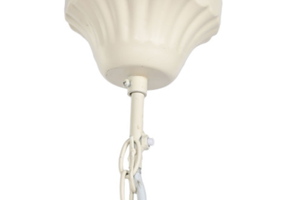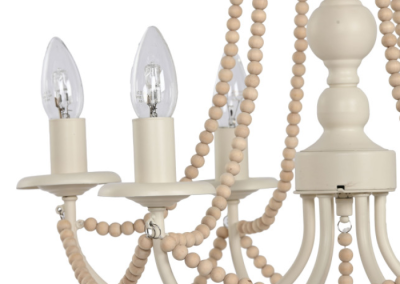 Está fabricada en madera de pino y hierro, y combina el color crema del hierro con el color natural de la madera de pino. Cuenta con 6 brazos y varias cadenas de bolas de madera que le dan un estilo único.