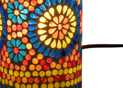 Fabricada en vidrios de colores y escayola es perfecta para espacios pequeños por su forma alargada hacia arriba. Con sus vidrios de colores forma un bonito mosaico que te dejará sin palabras.