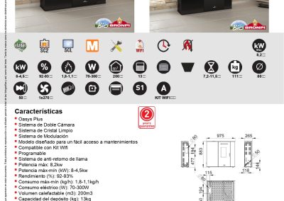 Oasys Plus. Sistema de Doble Cámara. Sistema de Cristal Limpio. Sistema de Modulación. Modelo diseñado para un fácil acceso a mantenimientos. Compatible con Kit Wifi. Programable. Potencia máx: 8,5kw. Potencia máx-mín (kW): 8-4kw. Rendimiento (%): 92-93%. Consumo máx-mín (kg/h): 1,8-1,1kg/h. Consumo eléctrico (W): 70-300W. Volumen calefactable (m3): 200m3. Capacidad del depósito (kg): 17kg. Interior Vermiculita. Quemador en fundición. Autonomía mín-máx (h.): 7,2-11,5h. Peso (kg): 107kg. Diámetro salida de humos (mm): 80mm. Diámetro aspiración de aire (mm): 50mm. Ventilación forzada (n° x m3): 1×270. Mando a distancia. Posibilidad de salida de humos superior, lateral o trasera.
