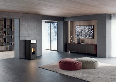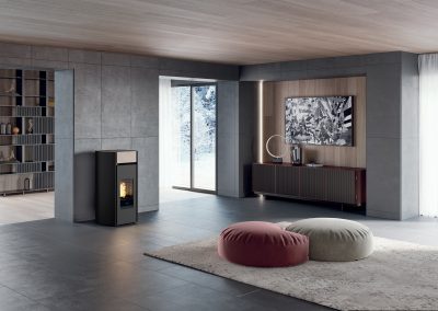 Modelo diseñado para un fácil acceso a mantenimientos. Largo: 54,5cm. Profundidad: 55cm. Altura: 112cm. Potencia útil: 3,5-12,3kw. Rendimiento (%): 90%. Consumo mín-máx. (kg/h): 0,8-2,8kg/h. Volumen calefactable (m3): 320m3. Capacidad del depósito (kg): 25kg/h. Autonomía mín-máx (h.): 9-31. Diámetro salida de humos (mm): 80mm. Diámetro aspiración de aire (mm): 40mm. Programación diaria / semanal. Función EASY TIMER. Sistema The Mind con WI-FI integrado. Radiomando “Mind Remote”. Función RELAX.