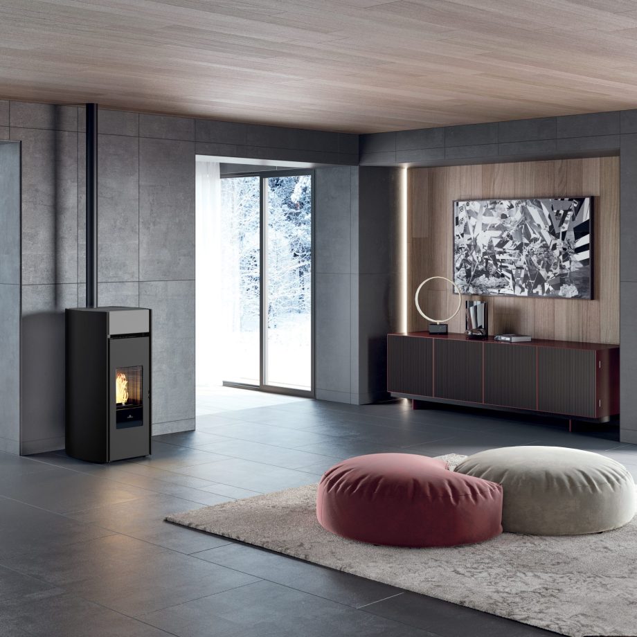Modelo diseñado para un fácil acceso a mantenimientos. Largo: 54,5cm. Profundidad: 55cm. Altura: 112cm. Potencia útil: 3,5-12,3kw. Rendimiento (%): 90%. Consumo mín-máx. (kg/h): 0,8-2,8kg/h. Volumen calefactable (m3): 320m3. Capacidad del depósito (kg): 25kg/h.  Autonomía mín-máx (h.): 9-31. Diámetro salida de humos (mm): 80mm. Diámetro aspiración de aire (mm): 40mm. Programación diaria / semanal. Función EASY TIMER.  Sistema The Mind con WI-FI integrado. Radiomando “Mind Remote”. Función RELAX.