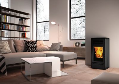 Modelo diseñado para un fácil acceso a mantenimientos. Largo: 46cm. Profundidad: 49cm. Altura: 99cm. Potencia útil: 3,8-9,2kw. Rendimiento (%): 88,5%. Consumo mín-máx. (kg/h): 0,9-2,2kg/h. Volumen calefactable (m3): 240m3. Capacidad del depósito (kg): 24kg/h.  Autonomía mín-máx (h.): 11-27. Diámetro salida de humos (mm): 80mm. Diámetro aspiración de aire (mm): 40mm. Programación diaria / semanal. Función EASY TIMER.  Sistema The Mind con WI-FI integrado. Radiomando “Mind Remote”. Función RELAX  (aire caliente desactivable).