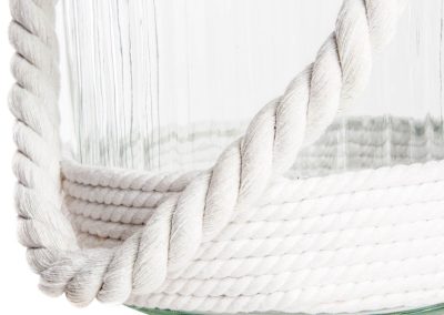 Portavela, jarrón…cuando una pieza es bonita y funcional las funciones para lo que se pueden utilizar se multiplican, esto es lo que le pasa a nuestro portavela fabricado en cristal con unos bonitos adornos en cuerda un portavela diferente con una bonita cuerda en color blanco en su parte inferior, y además una cuerda a modo de asa decorativa que le da una estetica muy delicada y bonita.