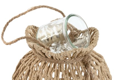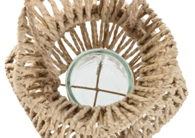 Descubre el Portavela cuerda y metal natural, una pieza única que aportará un toque rústico a tu hogar. Con medidas de 17 x 17 x 32 cm, este portavelas incluye un vaso de cristal en su interior, perfecto para albergar tu vela favorita. Su diseño natural y auténtico lo convierte en el complemento ideal para cualquier espacio.