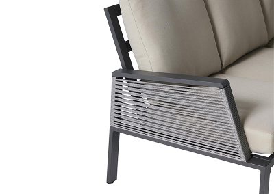 Te aseguramos que este verano pasarás muchas horas en la Rinconera Taku en color gris. Está compuesto por una mesa, junto con un sofá rinconera. La mesa está fabricada en aluminio, material resistente. El sofá con chaise longue cuenta con una estructura de aluminio con recubrimiento de pintura en polvo para otorgarle durabilidad. Los cojines que incluye son desenfundables con un tapizado de polyspun, su relleno de espuma y fibra conceden un plus de confort. Además, las patas de este conjunto incorporan tacos para proteger el suelo.