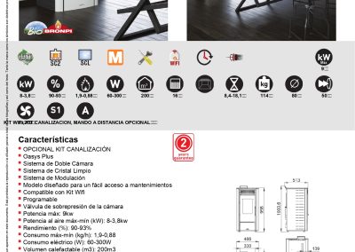 OPCIONAL KIT CANALIZACIÓN. Oasys Plus. Sistema de Doble Cámara. Sistema de Cristal Limpio. Sistema de Modulación. Modelo diseñado para un fácil acceso a mantenimientos. Compatible con Kit Wifi. Programable. Válvula de sobrepresión de la cámara. Potencia máx: 9kw. Potencia al aire máx-mín (kW): 8-3,8kw. Rendimiento (%): 90-93%. Consumo máx-mín (kg/h): 1,9-0,88. Consumo eléctrico (W): 60-300W. Volumen calefactable (m3): 200m3. Capacidad del depósito (kg): 16kg. Interior fundición. Autonomía mín-máx (h.): 8,4-18,1h. Peso (kg): 114kg. Diámetro salida de humos (mm): 80mm. Diámetro aspiración de aire (mm): 50mm. Ventilación forzada (n° x m3): 1×270. Sistema seguridad: S1.: Termostato seguridad pellet, Depresímetro. Accesorios compatibles no incluidos: KIT WIFI, KIT CANALIZACION, MANDO A DISTANCIA OPCIONAL.