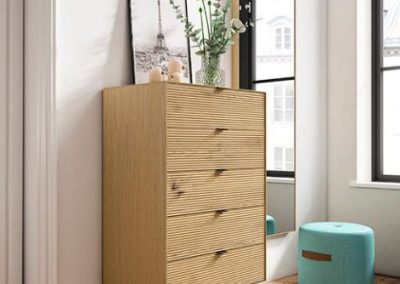 El sinfonier Satul es un mueble fabricado en madera de roble y además tiene una patas en metal que le dan altura y además facilita la limpieza en la parte de abajo, tiene unos bonitos listones en su parte frontal y esta formado por cinco cajones donde podrás guardar todo lo que necesitas.