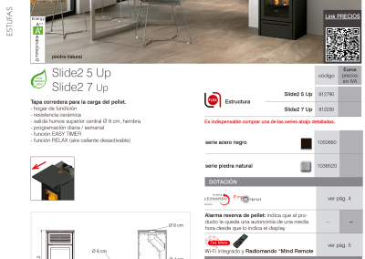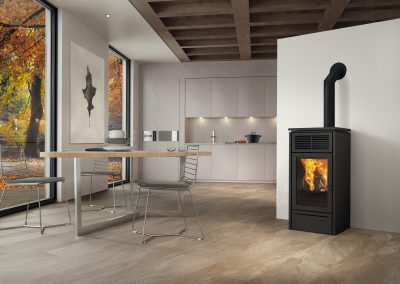Modelo diseñado para un fácil acceso a mantenimientos. Largo: 46cm. Profundidad: 49cm. Altura: 99,5-101cm. Potencia útil: 3-6,9kw. Rendimiento (%): 88%. Consumo mín-máx. (kg/h): 0,7-1,6kg/h. Volumen calefactable (m3): 180m3. Capacidad del depósito (kg): 20kg/h.  Autonomía mín-máx (h.): 13-29. Diámetro salida de humos (mm): 80mm. Diámetro aspiración de aire (mm): 40mm. Programación diaria / semanal. Función EASY TIMER.  Sistema The Mind con WI-FI integrado. Función RELAX  (aire caliente desactivable)- alarma reserva de pellet.
