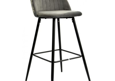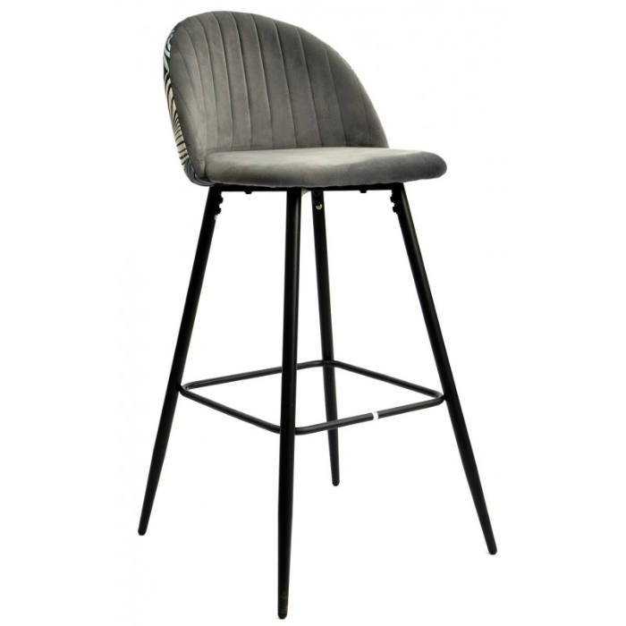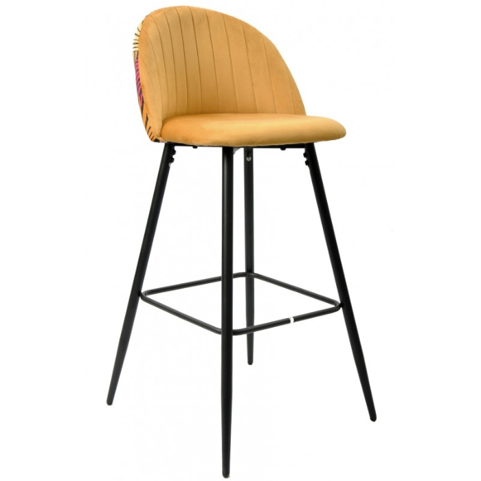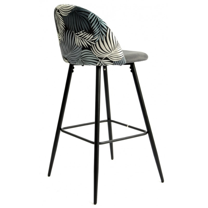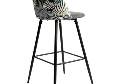 Es un taburete de diseño, con un armazón metálico con acabado epoxi negro, asiento y respaldo tapizados en terciopelo y su parte trasera en tejido decorado floral a juego.