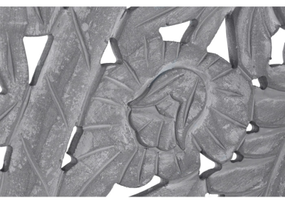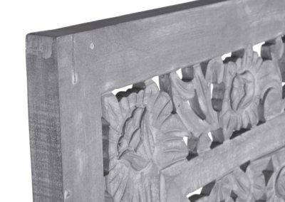 Talla de madera Mdf, en color gris con detalles en desgastando dejando a la vista un color natural. Talla formada por tres piezas independientes que da la posibilidad de poder colocarla a la distancia elegida. Procucto versátil ya que ofrece la posibilidad de utilizarlo tanto como adorno de pared como cabecero de cama.