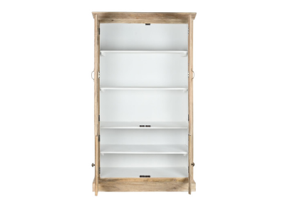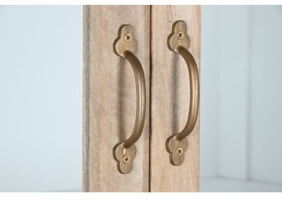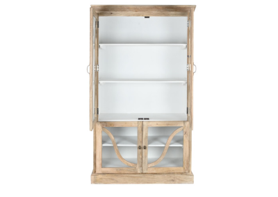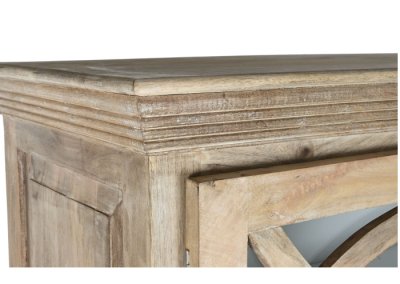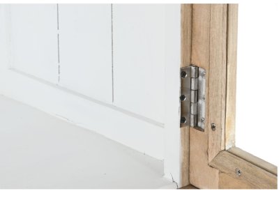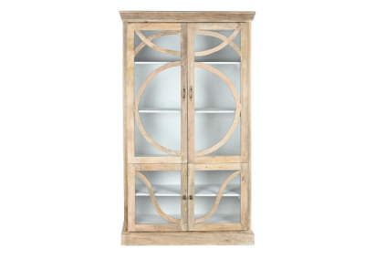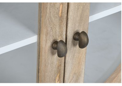 La Vitrina de mango combina la elegancia del cristal con la calidez de la madera maciza de mango en un acabado banco decapé. Con 4 puertas de cristal, 3 baldas y medidas de 120cm de ancho, 50cm de profundidad y 205cm de alto, esta vitrina ofrece un amplio espacio de exhibición para tus mejores objetos.